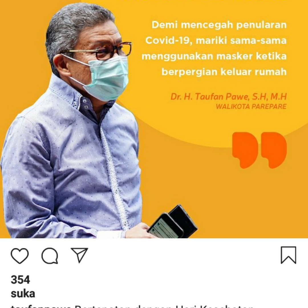 Di tempat yang berbeda, Wali Kota Parepare Dr. H. M. Taufan Pawe menghimbau agar masyarakat menggunakan masker. Hal itu disampaikan dalam akun instagram resminya (@taufanpawe) yang diunggah bertepatan Hari Kesehatan Internasional pada tanggal 7 April. “Memperhatikan anjuran WHO, maka kami mengharapkan kepada seluruh lapisan masyarakat di kota Parepare, yang sakit maupun sehat untuk menggunakan masker ketika berpergian di luar rumah,” tulisnya.